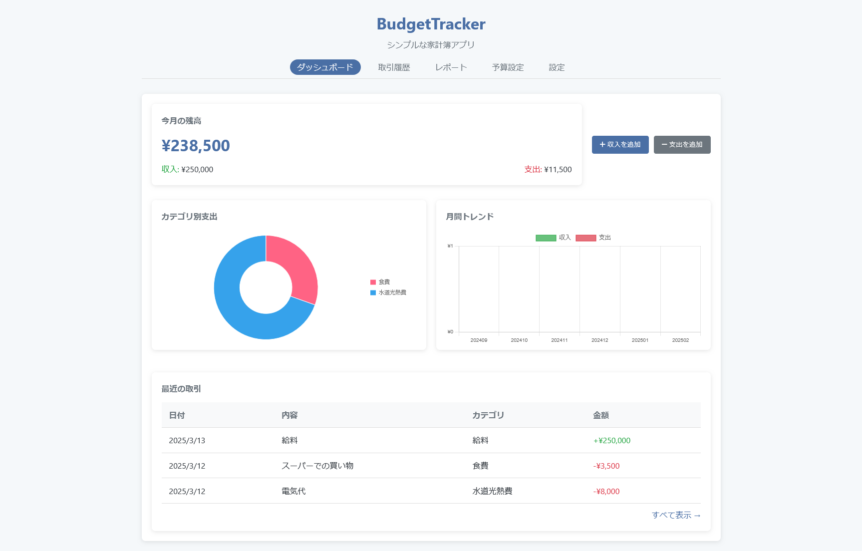 BudgetTracker ¥2,970 - BudgetTracker個 + お買い物カゴに追加 カテゴリー: ソフトウェア 説明 レビュー (0) 説明 シンプルな家計簿ソフトウェア BudgetTrackerは、日々の収支を簡単に記録し管理できる家計簿アプリです。複雑な機能はなく、必要最低限のシンプルな操作で家計管理ができます。 対応OS Windows 8/10/11 macOS 10.13以降 動作環境 メモリ: 1GB以上 ストレージ: 50MB以上の空き容量 主な機能 収支記録 カテゴリ別集計 月別レポート 基本的な予算設定 簡易グラフ表示 CSVインポート/エクスポート 定期的な支出の登録 レビュー レビューはまだありません。 “BudgetTracker” の口コミを投稿します コメントをキャンセルメールアドレスが公開されることはありません。 ※ が付いている欄は必須項目です評価 * 評価… 最高 良好 平均 良くない 悪い レビュー *名前 * メール * 次回のコメントで使用するためブラウザーに自分の名前、メールアドレス、サイトを保存する。 Δ 関連商品 TaskTimer Pro ¥3,960 お買い物カゴに追加 MarkNote Editor ¥2,420 お買い物カゴに追加